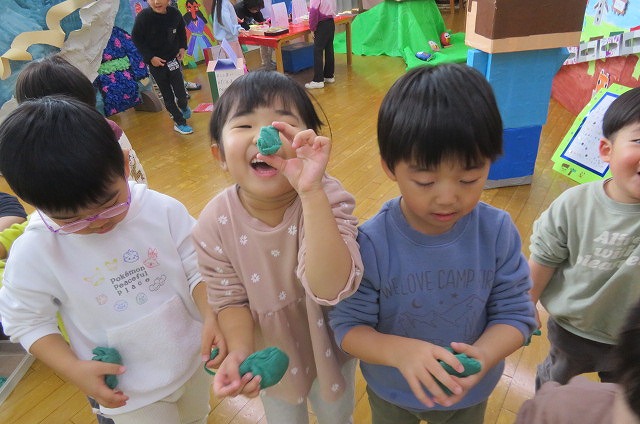 また、【お月見会】【やきいも会】【七五三】【ハロウィン】など秋を感じる行事もありました。そして…【中学生の職場体験】では立派に成長した卒園児が来て、子ども達も大喜び!『お姉さん、お姉さん』と甘えたり、一緒に遊んだりしました。